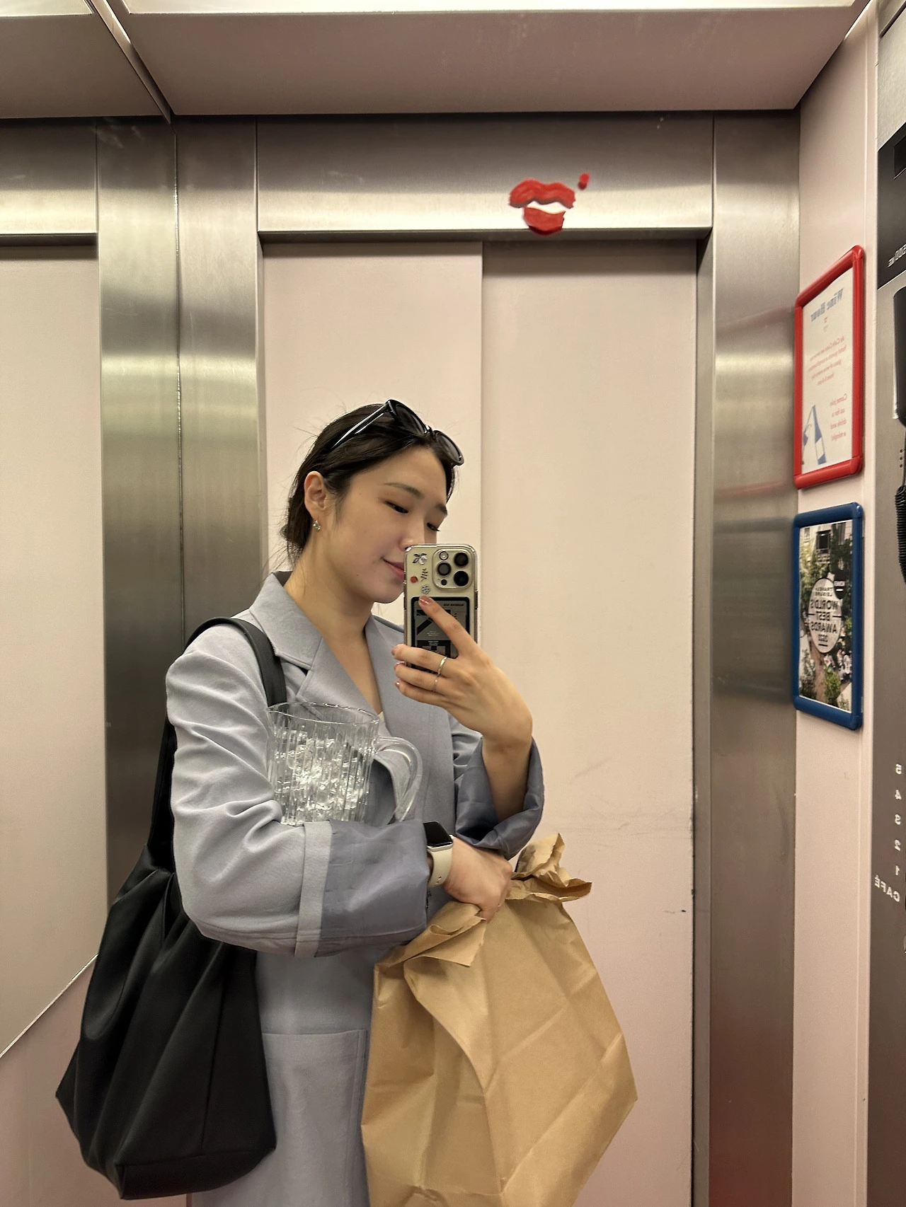 근처 공사로 입구를 겨우 찾은 헤이. 입구부터 헤이스러운 컬러와 가구, 그리고 너무 귀여운 엘리베이터! 저 하늘색 문이 엘리베이터다. 올라갈 땐 엘리베이터, 내려올 땐 계단으로 내려오기로!