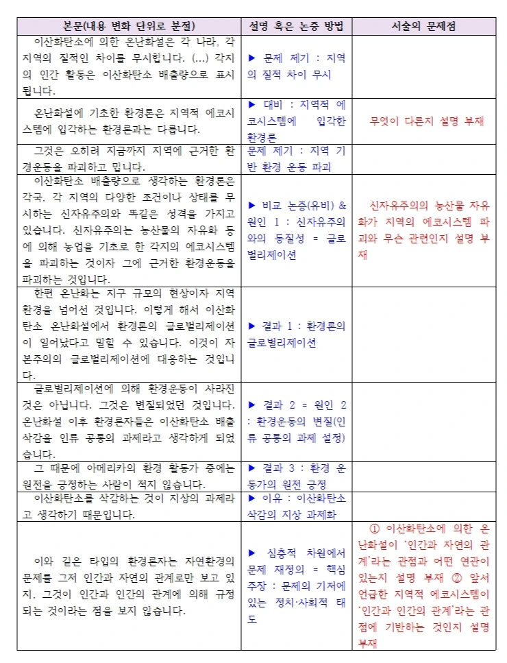 가장 적은 답변은 ‘이산화탄소에 의한 온난화설을 주장하는 사람들이 제시하는 원인과 해결책은 지역적 특성을 간과하고 있다’ 정도이다. 그나마 모범 답안에 ‘근접한’ 답변이다. 그러나 반드시 포함되어야 하는 ‘핵심 중의 핵심’이 포함되지 않았다.