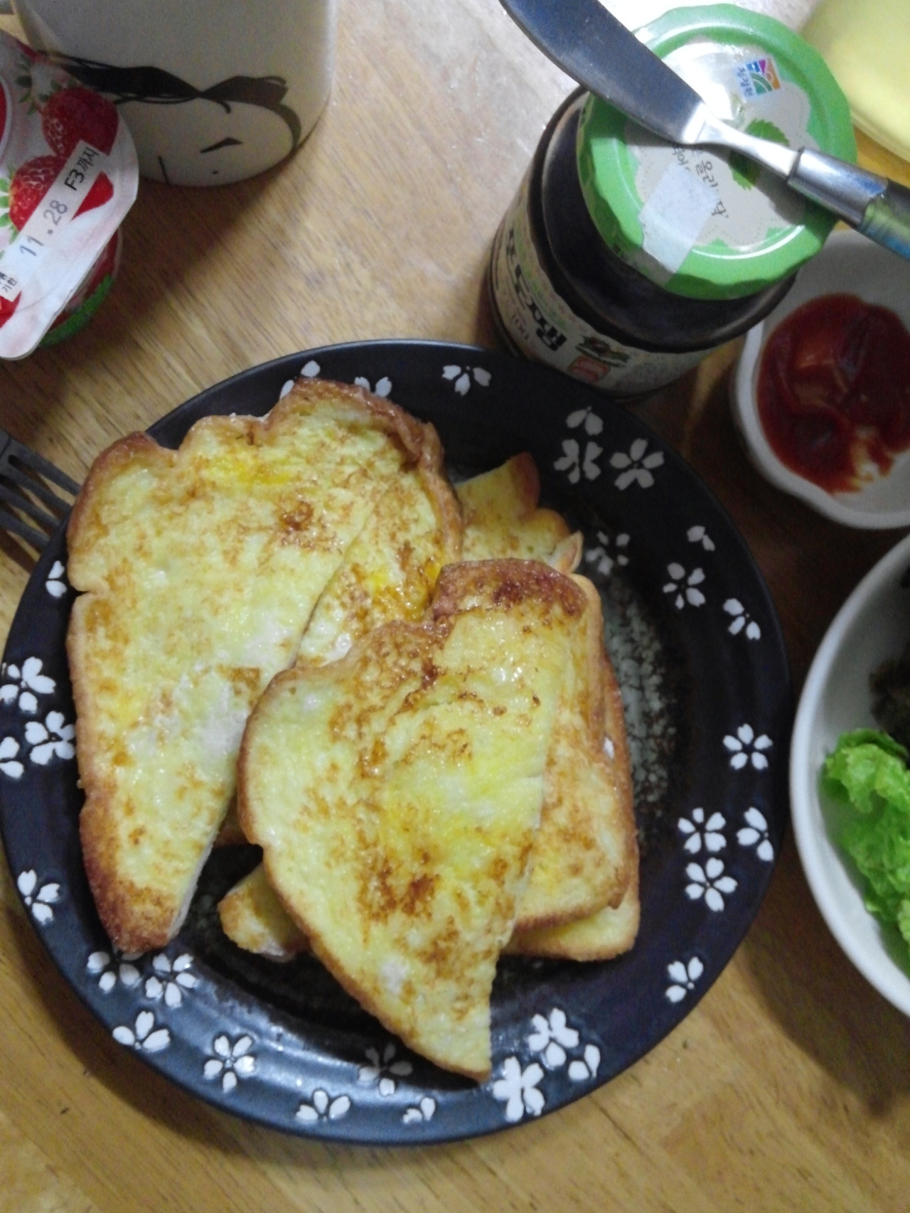 우유와 계란을 1:1 비율로 섞어 잘 저은 다음, 식빵을 적셔서 약한 불에 구우면 되는 쉬운 요리지.