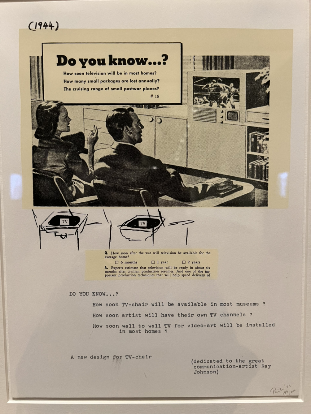백남준이 있었다. Global Groove라는 28분 30초짜리 작품이었는데 1973년에 이런 미디어 작품을 만들었다는 것이 믿어지지 않았다. 특히 첼리스트가 인터뷰를 하다가 화면이 클로즈 업 되면서 미디어 매체를 연주하는 장면은 오늘날 기술과 예술의 공존을 예언하는 것으로 여겨졌다. 이십일세기에 예언자가 존재한다면 아마 예술가가 그 역할을 하고 있으리라 믿는다. 미래를 예언하는 듯한 실크 스크린 작품의 질문들을 보고 놀라지 않을 수가 없었다. 당시에 TV의자가 미래적이었다면, 현재 스마트 폰의 위력을 고려했을 때 미래에 ‘기술과 인간’은 어떤 모습으로 공존할지 무척 궁금해진다.