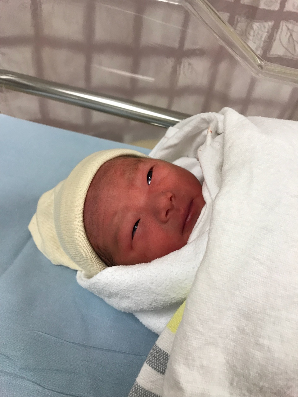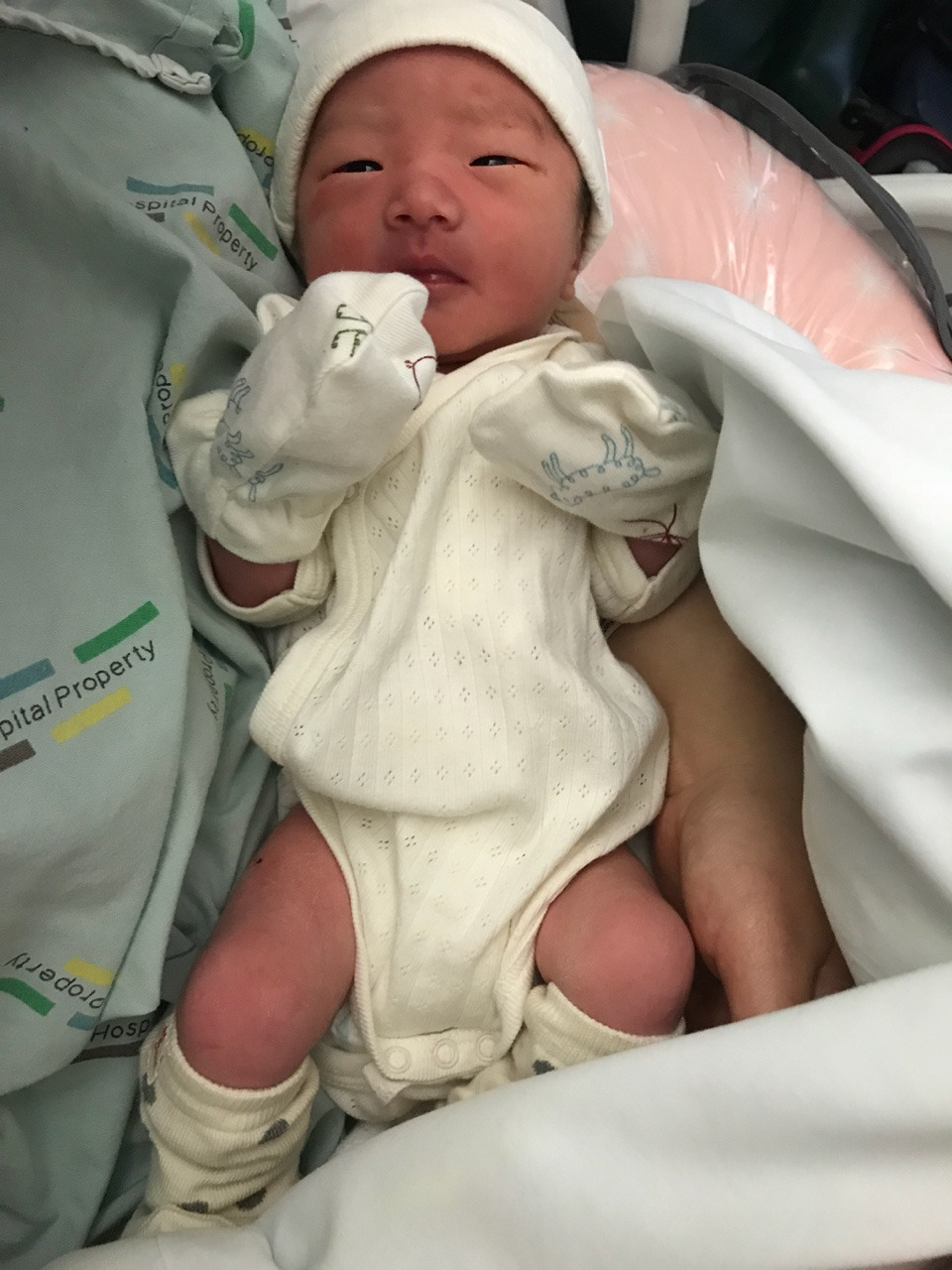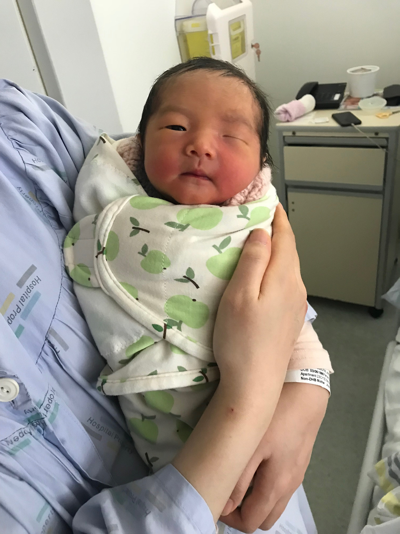 엄마 아빠가 야심 차게 준비해온 엘림이의 첫 옷은 보기에는 예쁠지 몰라도 실용성은 꽝이었습니다. ( ㅠㅠㅋㅋㅋㅋㅋㅋ) 지금 뉴질랜드는 한겨울입니다. 우리 엘림이 첫 옷엔 미안하게도 다리가 없었습니다. 보기만 해도 춥네요.... (엘림아 미안해 ㅠㅠ 엄마가 예쁜 거만 생각했나 봐....) 엘림이가 너무 추워 보였는지 미드 와이프는 '내가 아기를 쪼금 따뜻하게 해줄게! ^^' 하더니 엘림이를 데리고 나가 니트로 짠 털모자와 하늘색 카디건을 입힌 후, 스와들로 꽁꽁 싸매서 데려왔습니다. 아마도 옷을 미처 준비해오지 못한 산모들을 위해 신생아용 모자와 여벌 옷가지를 병원에서 준비해 놓았나 봅니다.