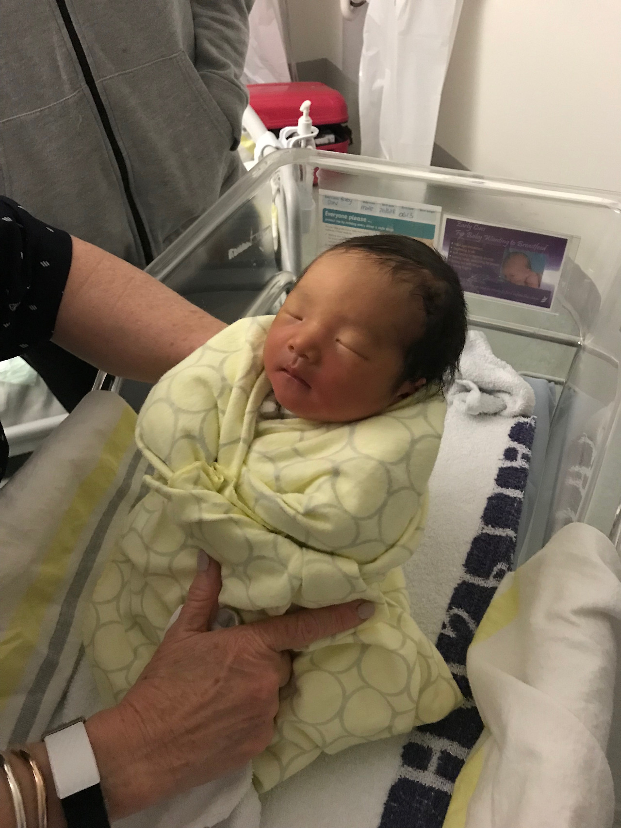 수술을 마친 지 얼마 되지 않았던 저는 아직 하반신 마취가 풀리지 않아 다리를 움직일 수 없었습니다. 화장실도 갈 수 없는 상태라 소변줄을 꼽은 채 침대에서 한 발자국도 벗어나지 못하는 신세가 되었습니다. 잠시 후 병원 소속 미드 와이프(미드 와이프에 대한 설명은 전편 참고)가 병실로 방문해 “아기에게 옷을 입혀줄까?” 하고 물었습니다. 집에서 설레는 맘으로 챙겨가지고 온 아기 옷을 미드와이프에게 건넸습니다. 초보 엄마 아빠를 대신해 아기에게 옷을 입혀준 미드와이프.