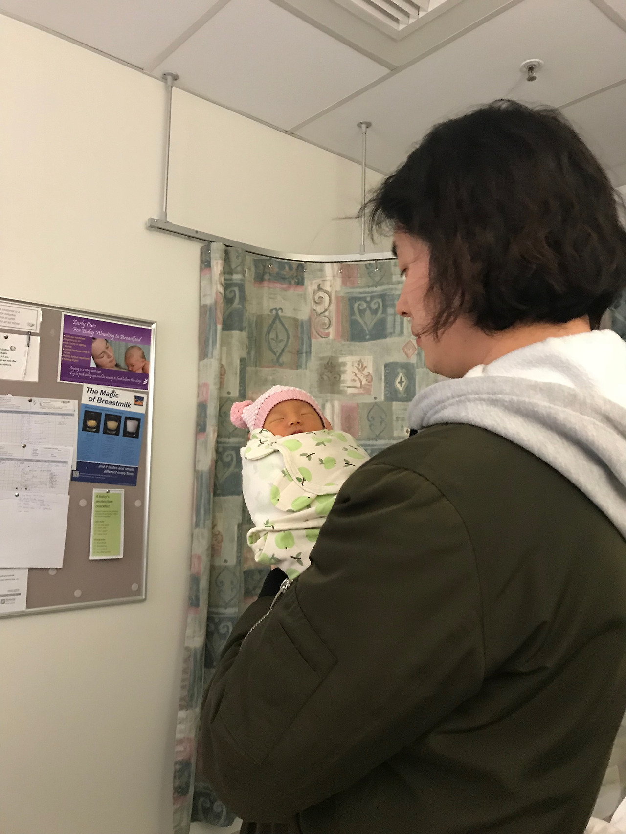 뉴질랜드는 국가차원에서 모유수유를 권장합니다. 병실의 한쪽 벽면에 위치해있던 게시판에는 모유수유의 장점이 쭈욱- 나열되어 있었는데 게시판을 정확히 찍은 사진이 없어 슬쩍 게시판이 스쳐 찍힌 사진이지만 아래에 첨부합니다. 모유수유에 관한 도움을 원하는 산모에게는 모유수유 전문가와 만나 상담할 수 있도록 세션을 제공하기도 합니다. 모유 수유하며 어려움을 겪는 경우 상담할 수 있는 전문 기관도 여럿 마련되어 있습니다. 저는 오랜 진통과 제왕절개 수술로 인해 엄청난 양의 진통제를 사용한 데다가 수술 후 여전히 여러 가지 약을 복용하고 있었기 때문에 시부모님께서는 그 상태로 모유 수유해도 괜찮은 건지 걱정하시기도 했습니다. 병원에 물어보니 수술에 사용했던 진통제들은 아기에게는 전혀 해가 되지 않고, 출산 병동에 입원해 있는 동안 복용하는 모든 약물은 모유수유에 전혀 해롭지 않은 것들만 골라서 사용하고 있다고 했습니다. 병원 측에서는 안심하고 모유 수유할 수 있는 환경을 만들어주고 산모로 하여금 모유 수유하도록 적극 권장했습니다.