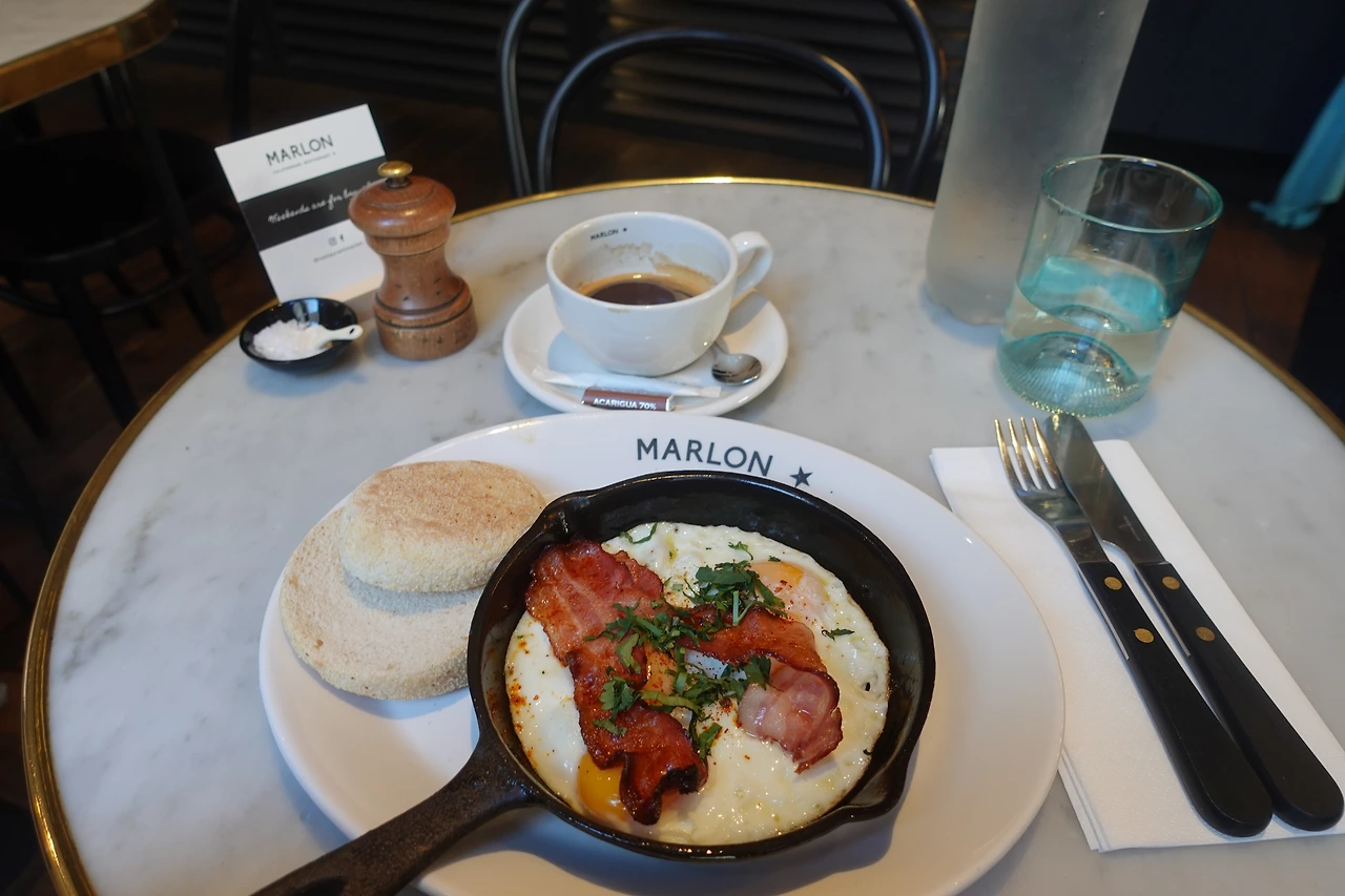 캘리포니안 레스토랑이라고 쓰여있던 카페 'Marlon'에서는 Fried Eggs & Bacon이라는 메뉴와 더블 에스프레소를 시켰다. 역시 커피를 먹어줘야 하루가 시작되는 나란 인간, 커피 한모금을 마시니까 뇌에 엔돌핀이 쫙 도는 기분이 들었다. 완벽한 아침이었다. 내가 시켰던 메뉴는 더할 나위 없는 브런치로, 달걀의 담백함과 베이컨의 짭쪼름함, 그리고 빵의 쫄깃함이 더해져 식감이든 맛이든 조화를 잘 이루고 있었다는 점에서 별 네 개 정도는 줘도 될 듯하다. (구 피처에디터의 직업적 본능이라고 치자.) 원래는 사실 어딜가도 무난한 아보카도 토스트를 시키려다가 옆 테이블에서 저걸 시킨 걸 보고 괜스레 도전해보고 싶은 마음이 들어서 시켰던 건데 결과적으로는 매우 만족스러웠다.
