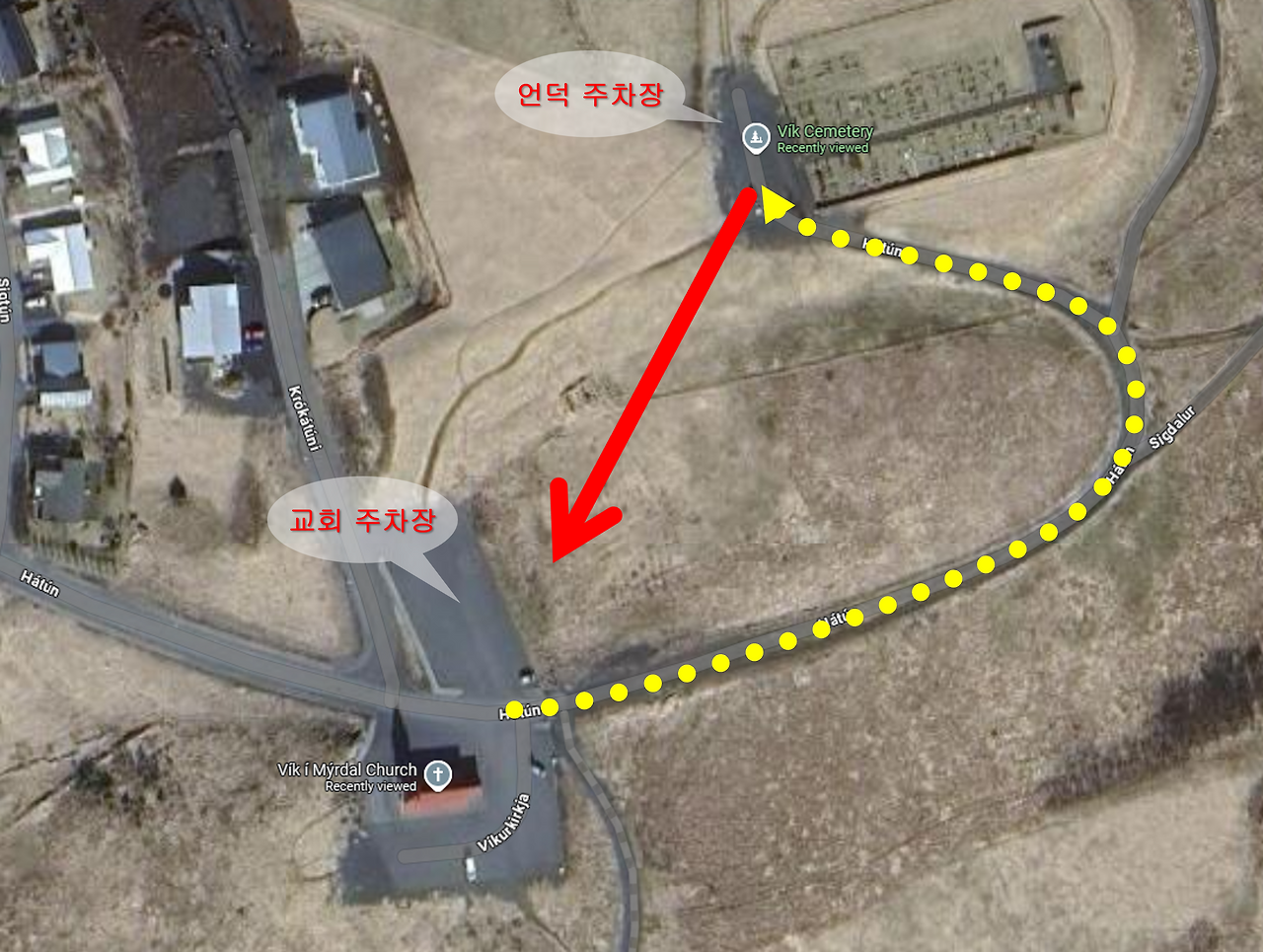비크 이 뮈르달 교회 뷰포인트는 교회 위쪽 언덕이다. 교회 주차장에 주차하고 걸어갈 수 있는데 언덕에도 주차공간이 있어 차로 올라가도 된다.