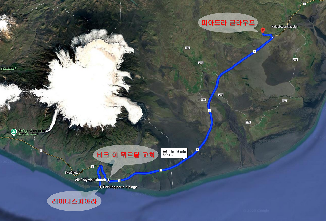 들뜬 마음으로 차에 돌아와 구글맵을 켰다. 링로드를 따라 동쪽으로 가면 난파 비행기를 보기위해 서쪽으로 다시 돌아와야 했다. 그래서 숙소는 레이니스피아라 바로 옆에 있는 비크 마을에 예약하고 동쪽으로 150km 떨어진 스카프타펠과 스비나펠스요쿨까지 가기로 했다.