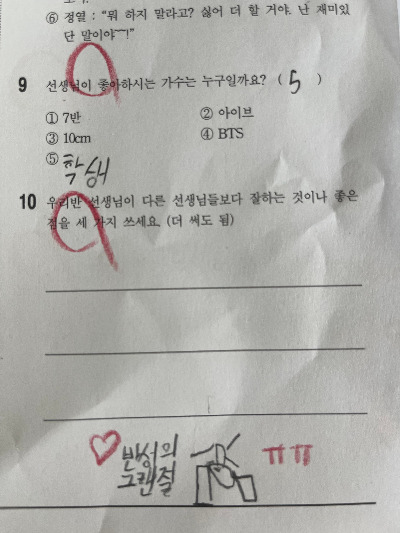 아이들 시험지를 걷어서 보며 귀여운 알랑방귀에 흐뭇하던 중 마지막 문제를 풀지 못한 시험지를 발견했다. 빈칸 아래에는 큰 절을 하는 듯한 그림과 ‘반성의 그랜절’이라는 여섯 글자가 있었다. 굉장한 고민 끝에 써낸 답인 듯 보였다. 혼자 한참 웃었다.