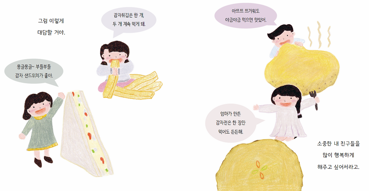 포슬포슬 감자가 꿈이었던 아이는 지금쯤 고등학생이 되었을 것 같다. 꿈이 감자였던 걸 기억하고 있을까? 그때 못한 이야기를 다시 나눠보고 싶다. 이번에는 감자를 내 마음대로 바꿔버리지 말고 어떤 이야기를 할지 가만히 듣고 싶다. 감자 말고 또 요즘 좋아하는 것, 관심 있는 것, 시간 가는 줄 모르고 하는 것들은 무엇이 있는지 궁금하다. 한 아이의 세상은 좁은 꿈에 들어가기엔 넓고 또 넓다.
