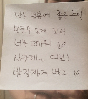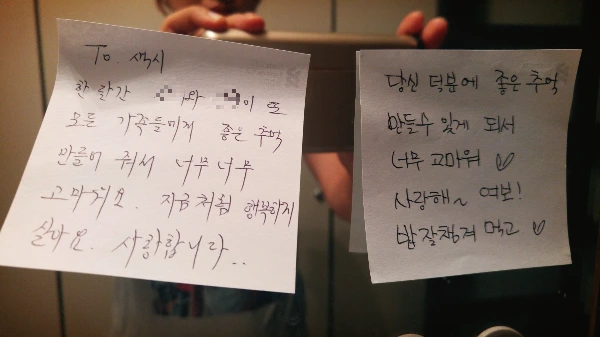 회사 출근 때문에 중간에 집으로 먼저 와야 하는 남편이 너무 고맙고도 미안해서 혼자 집에 오면 보고 잠시나마 웃으라고 이렇게 써 놓고 갔다.