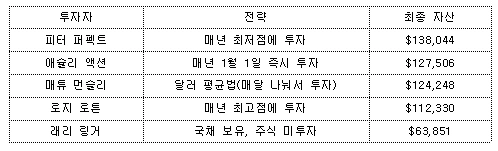 해당 표를 보시면 피터 퍼펙트라는 사람의 전략은 역시나 1등을 하지만 결과적으로 완벽한 타이밍을 맞추는 사람은 아무도 없다라는 것을 우리는 잘 알고 있습니다. 오히려 매년 1월 1일 즉시 투자한 애슐리와 같은 투자 방법이 현실적일텐데 실제 피터 퍼펙트에 준하는 성과를 거둘 수 있었고, 매튜 먼슬리 역시 달러 평균법(DCA) 방식으로 수행한 투자 역시 나쁘지 않은 성과를 보였습니다. 오히려 놀라운 점은 매년 최고점에 투자한 로지 로튼 역시 큰 차이 없는 수익을 거두었다는 점입니다. 오히려 래리 링거와 같이 기회를 기다리며 투자하지 않은 래리 링거는 저조한 성과를 거두었는데 이는 기다리는 시간이 길어질수록 자산은 물가상승과 기회의 비용에 의해 손해를 주기 때문입니다.