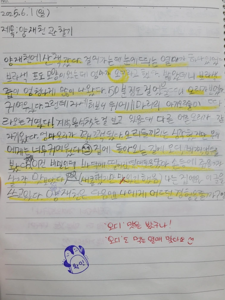 ♥ 위 글은 아들이 며칠 전 엄마와 함께 양재천에 산책 나갔다 돌아와서 쓴 글입니다.