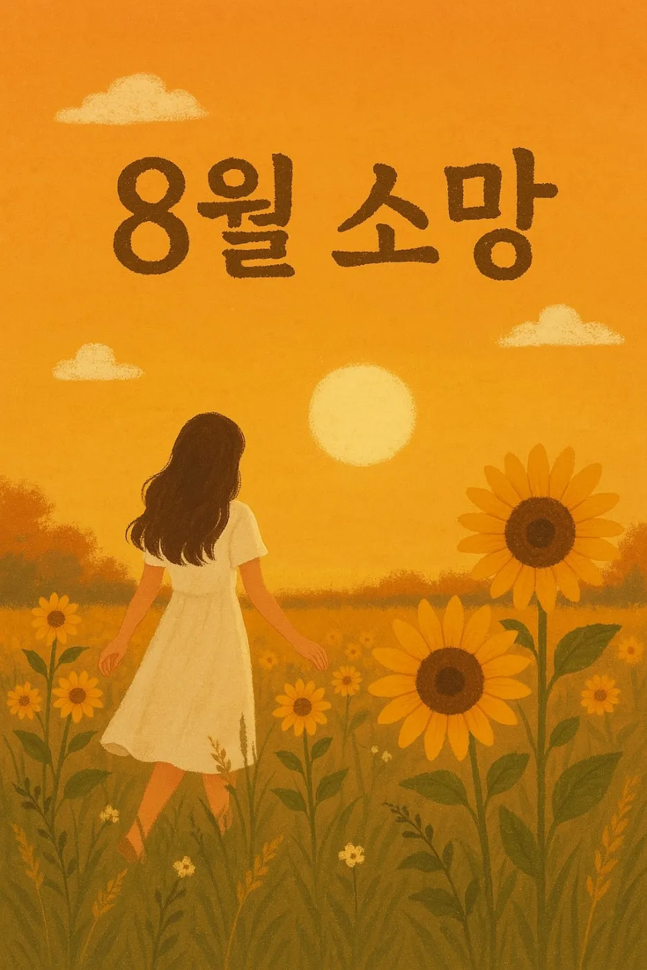 8월에는 제가 바라는 8가지 꿈을 가지고 『팔월 어거스트 소망』이라는 팔자 詩(N 행시)를 아래와 같이 적어봤습니다. 7월 정말 수고 많으셨습니다. 8월에도 모두 행복하시죠~**