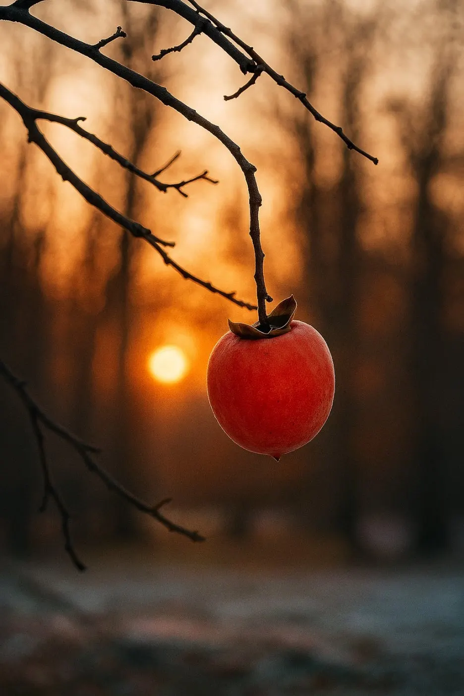 겨울밤에 얼어버린 홍시는 삶의 끝자락에서 맞이하는 고요한 죽음처럼 느껴집니다.