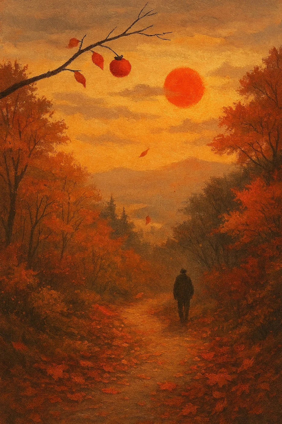 마지막 연에서 시인은 붉은 태양을 나뭇가지에 걸린 홍시처럼 바라보며, 그 순간을 ‘紅詩’라 명명합니다. 붉은 단풍, 흔들리는 가지, 그리고 그 사이에 걸린 태양은 마치 자연이 써 내려간 시 한 편처럼 느껴집니다.