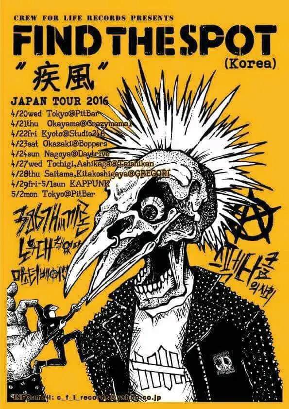 보컬 히로는 일본에서 가장 중요한 스래시/US 하드코어 펑크 레이블인 CREW FOR LIFE를 운영하고 있고, 도쿄 니시오기쿠보의 라이브하우스 PIT BAR의 주인이기도 하다. 한국과의 이 첫 연결 덕분에, 히로는 우리보다 먼저 반란과 SCUMRAID의 일본 투어를 기획해 주기도 했다.