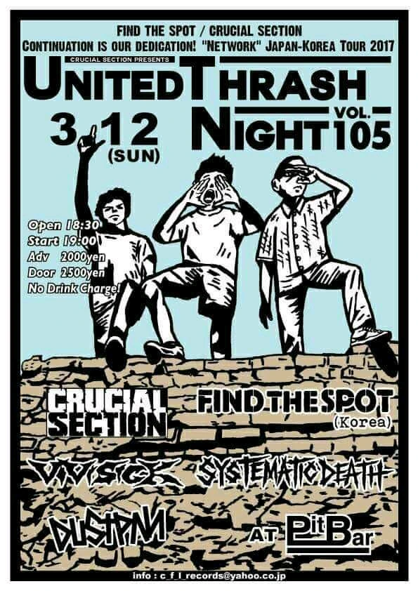 UNITED THRASH NIGHT는 CRUCIAL SECTION이 오래도록 이어온 기획 시리즈다. 도쿄 하드코어 씬의 중요 행사 중 하나. 단순한 이벤트가 아니라, 밴드와 관객, 세대와 세대를 묶어온 자리다. 나는 그 105번째 밤에 함께 서게 되었고, 훗날 150회에는 서울돌망치로 다시 이 무대에 서게 된다. 그 사실을 그때는 몰랐지만, 지금 생각하면 이 날은 어떤 흐름의 한복판이었다.