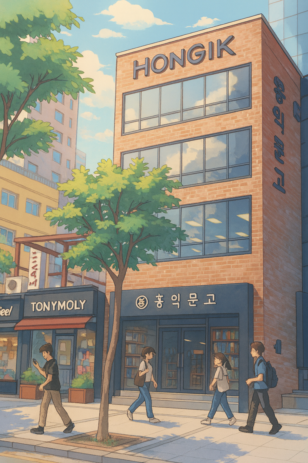 지하철로 내려가는 계단 앞, 모퉁이에 홍익문고가 있었다.
