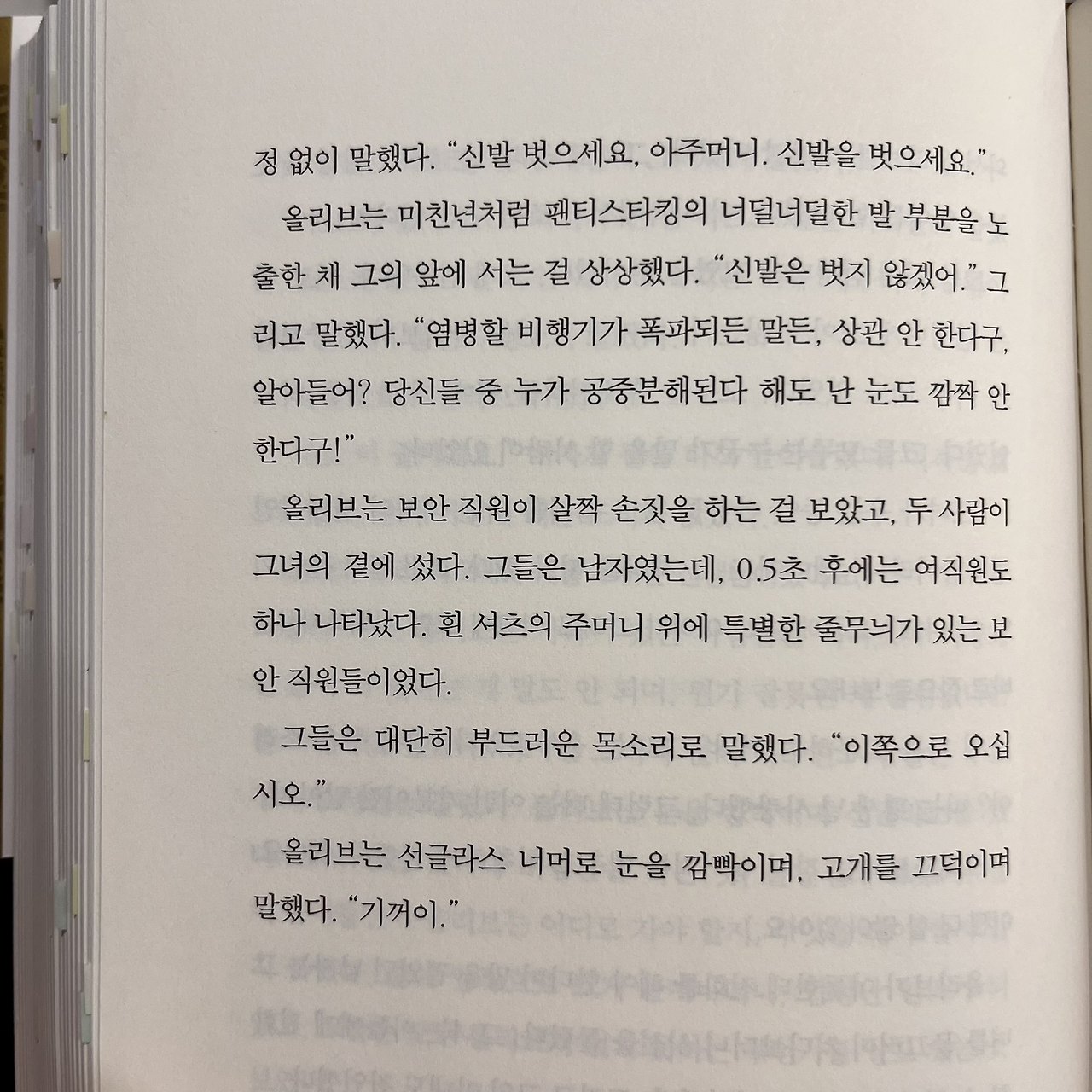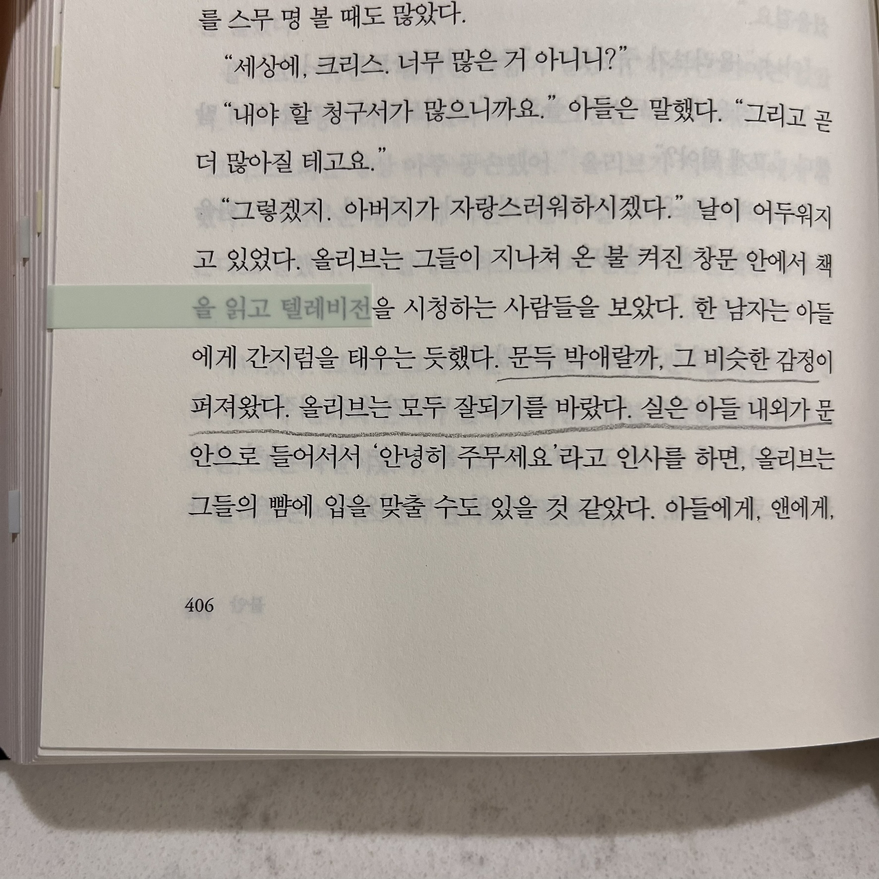 "그녀는 눈을 감았다. 지친 그녀는 파도를 느꼈다. 감사의, 그리고 회한의 파도를. 그리고 머릿속에 그려보았다. 햇살 좋은 이 방을, 햇살이 어루만진 벽을, 바깥의 베리베이를. 그것이 그녀를 힘들게 했다. 세상이. 그러나 올리브는 아직 세상을 등지고 싶지 않았다."