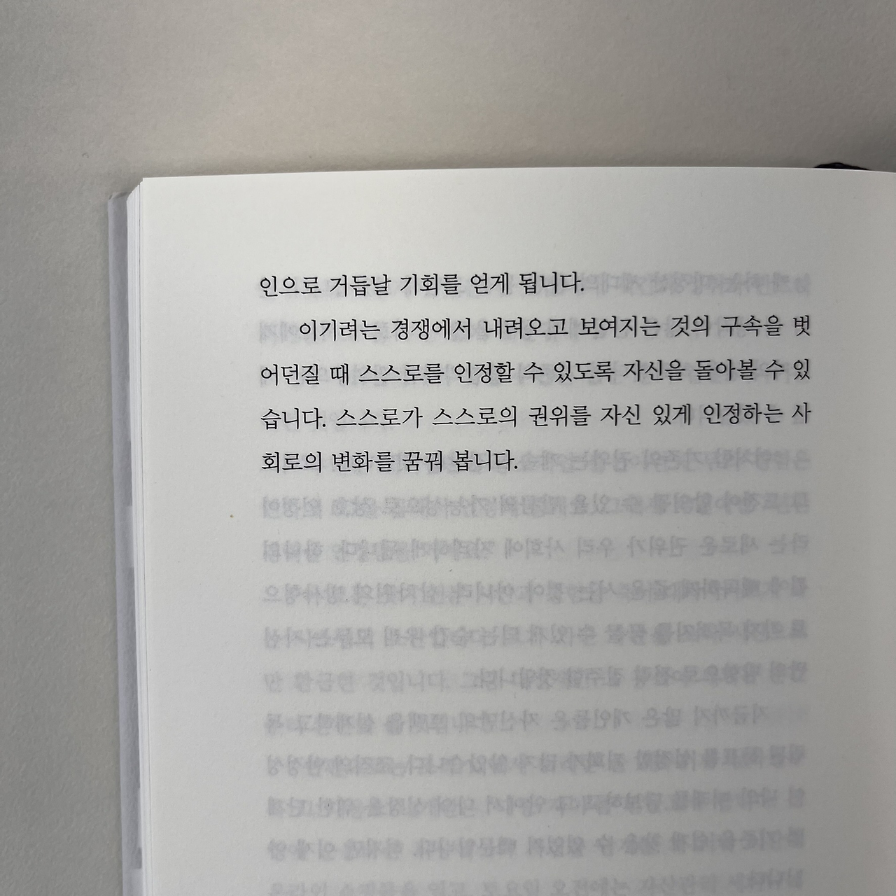 송길영 작가는 그의 저서 『시대예보: 핵개인의 시대』를 "스스로가 스스로의 권위를 자신 있게 인정하는 사회로의 변화를 꿈꿔 봅니다."라는 문장으로 마무리한다. 자기실현이 거창한 시대적 숙제로 느껴진다. 권위를 찾기 위해 노력해야 할 개인 내적인 숙제와 비경쟁적인 사회적 분위기 형성을 위한 개인 외적인-사회적인- 숙제까지! 마음이 삐죽해진다. '내 숙제를 아무리 잘해봐야 무슨 소용이람! 서로 인정해 주는 사회가 되어야 나도 나를 인정하지!'