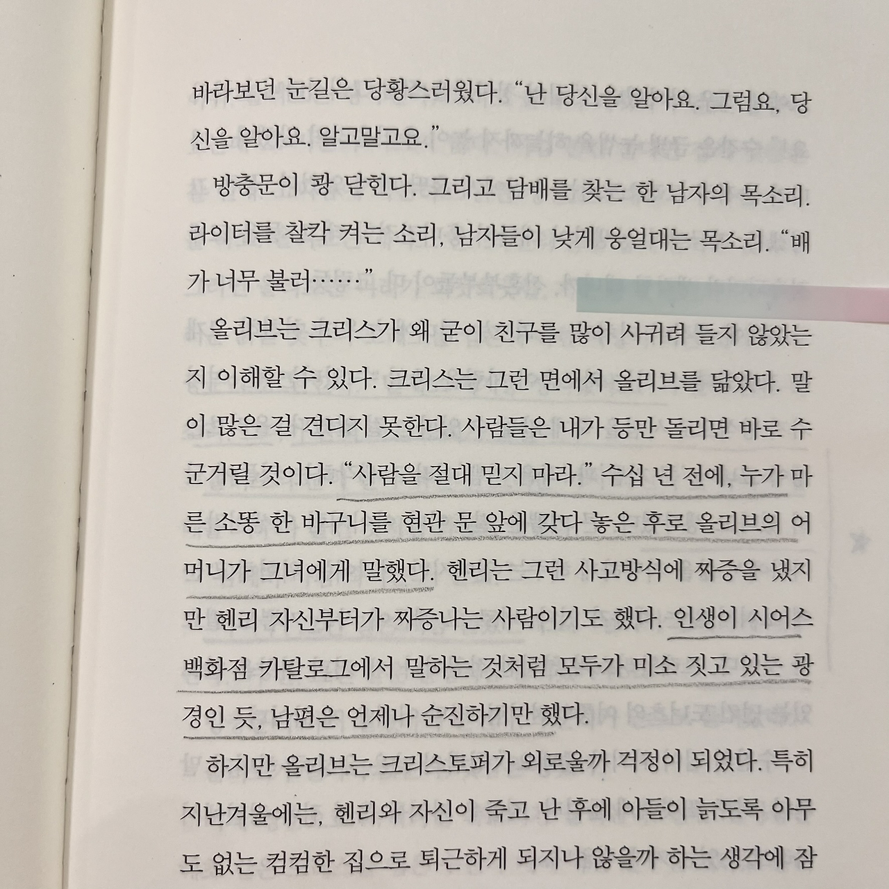 키르케고르의 말대로 우리가 느끼는 감정과 우리가 감정을 이해하는 방법은 별개이다. 감정이 부추긴 생각은 늘 충동적인 행동을 촉발한다. 우리는 감정에 숨겨진 자기(Self)를 만나야 한다. 감정을 빨리 해결해 치우려는 마음을 내려놓은 올리브는 두려운 마음을 담은 상태에서 동시에 사랑을 느낄 용기를 낼 수 있었다. 방어하고 싶은 마음이 올라오지만 동시에 자신이 잘못했을 수 있음을 받아들이고-올리브는 사과하지 않기로 유명한 인물이었다, 거부당할까 불안한 마음을 품은 상태에서 사랑이 필요하다고 표현할 수 있을 만큼 성숙한다. 책을 읽는 내내 그녀의 인생이 불행으로 마무리될까 봐 조마조마했던 마음이 책의 마지막 문장들로 편안해졌다.