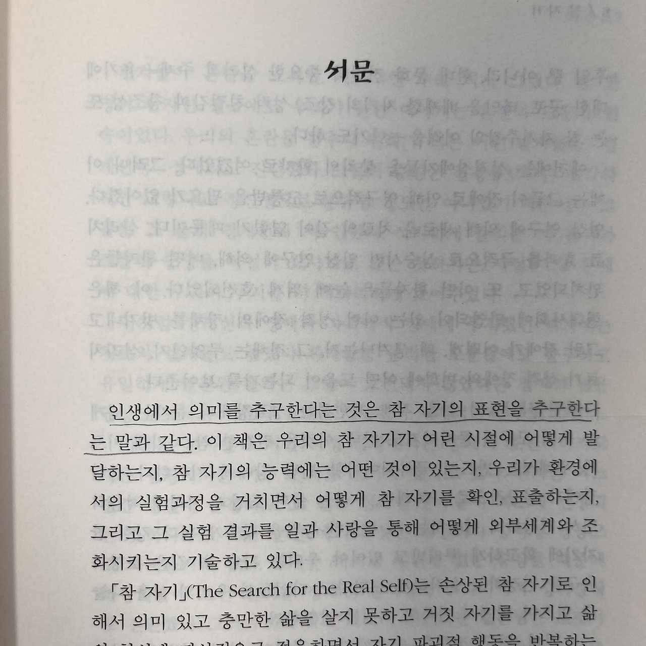 제임스 F. 매스터슨은 “인생에서 의미를 추구한다는 것은 참 자기의 표현을 추구한다는 말과 같다.”라는 문장으로 책의 서문을 연다. 철학자와 심리학자들은 자기만의 운율을 깨닫고 실현하는 삶이야말로 진정한 삶이라고 입을 모은다. 인본주의 상담의 창시자인 칼 로저스는 모든 유기체엔 고유의 잠재력을 '적극적'으로 실현하려는 '성장의 흐름'이 내재되어 있다고 결론짓고, 이를 ‘자기실현성향’ 혹은 ‘실현성향’이라고 불렀다. 자기실현이 본성이라면 높은 곳에서 낮은 곳으로 물이 흐르듯 자연스러운 일일 텐데 나에겐 왜 이리 어려운 숙제 같을까!