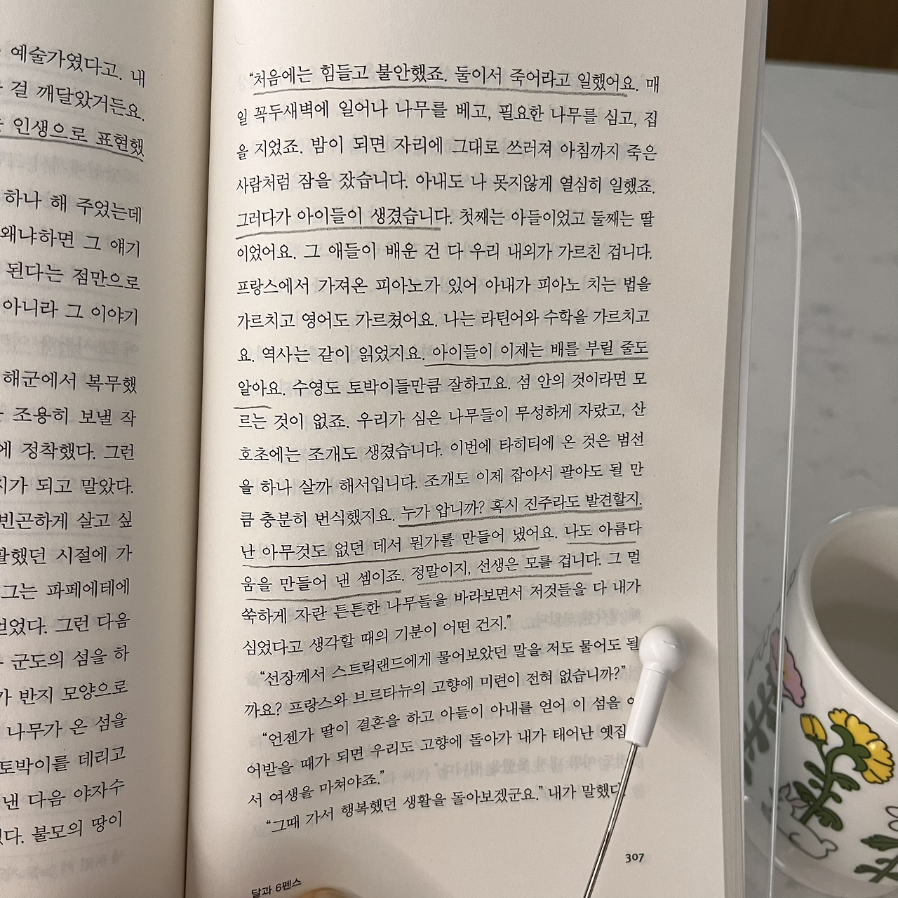 한 달에 한 번 있을까 말까 한 나른한 주말 오후라 마음이 너그럽다. 내 인생의 아름다움은 '달' 덕분일까, '6펜스' 덕분일까? 난 여전히 달을 좇고, 6펜스에 의지한다. 오늘의 여유는 아등바등 지낸 과거의 어느 날에 빚을 지고 있고, 소박한 미래에 만족하는 나의 평범함 덕이다. 그림 외엔 무엇에도 신경 쓰지 않았던 스트릭랜드는 투박한 개성으로 화가라는 자기실현을 이루었다. 원만한 개성의 브뤼노 선장은 조화로운 삶이라는 자기실현을 이루었다.