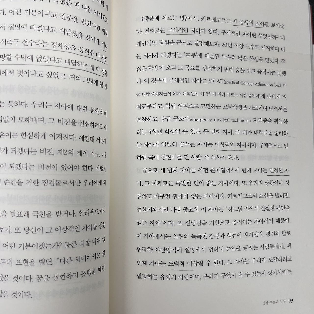 이후 하르트만, 코헛, 클라인, 융을 비롯한 여러 학자들의 깊은 연구를 통해 ‘자아’는 자기 자신에 대한 의식이나 관념을 의미하는 용어로, ‘자기’는 자신의 본질이자 전인의 독특하고 개인적인 측면을 의미하는 용어로 구분하여 사용하게 되었다. 융의 자전적 회고록인 『기억, 꿈, 사상』의 역자인 조성기는 <옮긴이의 서문>에서 “자기실현은 자아가 무의식 밑바닥 중심 부분에 있는 ‘자기’를 진지하게 들여다보고 그 소리를 듣고 그 지시를 받아 나가는 과정을 가리킨다.”라고 말한다. 키르케고르의 철학적 언어와 융의 심리적 언어는 ‘자기’를 규정하는데 큰 도움을 준다. 하지만 이해와 행동화의 거리가 멀듯, 자기와 닿아지지 않는 실현은 아는 채하는 우리를 코웃음 치며 바라보는 것 같다.