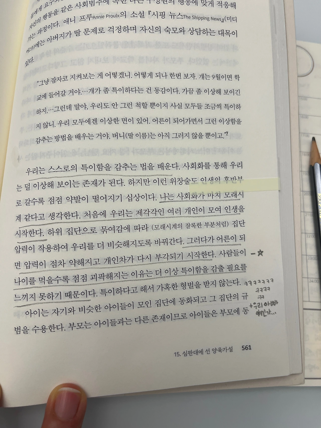대체로 인간은 모순투성이이다. 어우러지지 않는 성격들이 과자 종합선물세트처럼 커다란 박스에 담겨있다. 나만해도 참 극단적이다. 혼자 있는 걸 좋아하지만 친구들의 초대엔 웬만하면 빠지지 않고, 게으른데 열정적이며, 수줍음을 타는 편이면서도 직업은 사람을 많이 만나는 강사다. 20대에는 이런 나의 모순들이 부모탓 같았고, 30대에는 이 모순들이 밖으로 삐져나가지 않도록 숨기는 데 다급했다. 이런 노력도 무색하게 40대 중반이 지난 지금은 이 모순들이 감출 틈도 없이 튀어나온다. "사람들이 나이를 먹을수록 점점 괴팍해지는 이유는 더 이상 특이함을 감출 필요를 느끼지 못하기 때문이다. 특이하다고 해서 가혹한 형벌을 받지 않는다."는 해리스의 말이 맞다. 역시 그녀에겐 배울 점이 많다!