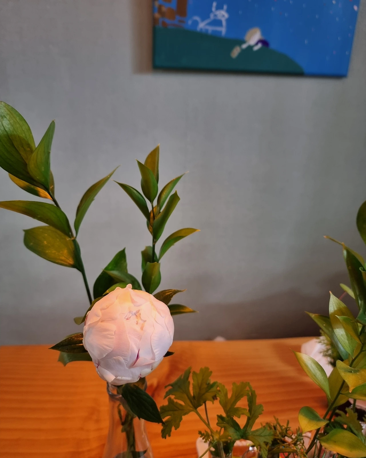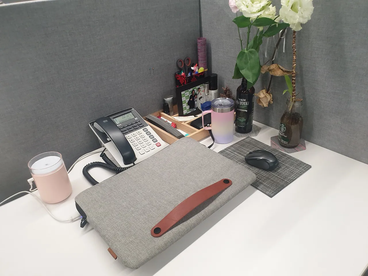 책상 위에는 유리병에 꽃 한 송이, 자질구레한 물건들을 정리해 놓은 작은 목재 정리함, 노트북 그리고 전화기. 그것이 전부였다.
