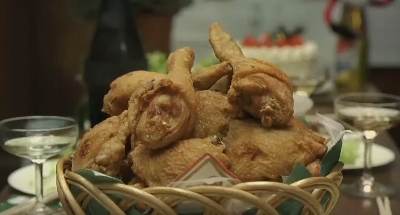 일을 끝내고 사장과 다이고, 여직원이 둘러앉아 치킨을 뜯는다.