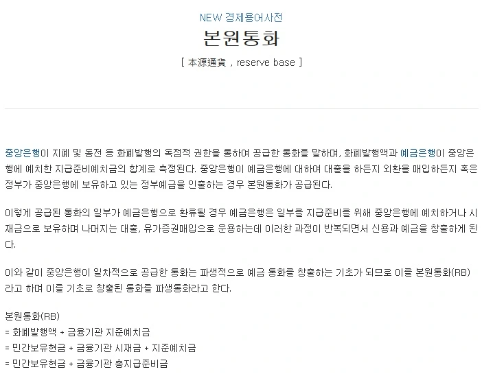 이 때 중앙은행이 시중은행(상업은행)에 공급한(빌려준) 돈을 '본원통화 RB: Reserve Base'라 한다.