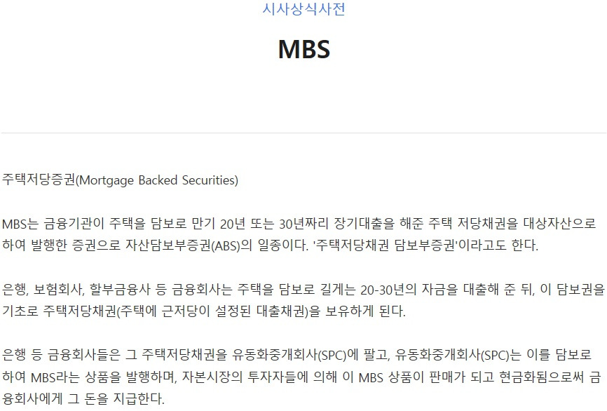 그렇게 말도 안 되는 일이 폭발적으로 늘어나는 계기는 '파생상품' 덕분이었다. 대표적인 상품이 '자산유동화 증권 ABS:Asset-Backed Securities'이고, 그중 부동산 자산을 담보로 발행하는 것이 '주택저당증권MBS:Mortgage Backed Securities'이었다.