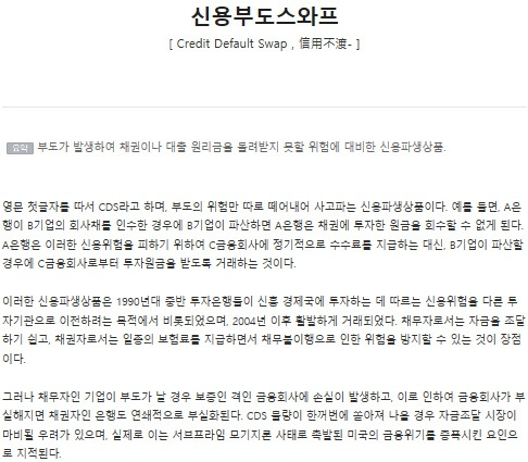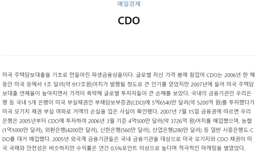 중요한 것은 알파벳 약자로 표현된 얼어 죽을 금융상품들이 아니다. 본인이 정확히 이해하지 못하는 금융상품은 절대로 투자해서는 안된다는 것이다. 어떤 이유로든 소위 전문가라 불리는 이들의 말을 맹목적으로 신뢰하지 말라는 것이다. 이 글도 그저 '하나의 의견'일 뿐이다. 뿌리 깊이 자세하게 이해해야 한다.