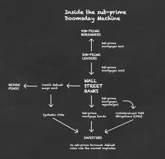 쓰레기 더미 위에 쓰레기를 쌓고 거품처럼 부풀려, 다시 거품을 기반으로 더 많은 거품을 만들어내는 과정으로 확대됐다. 이 모든 과정에 정부, 감시기관, 신용평가 회사, 대형 은행들이 함께 했다.