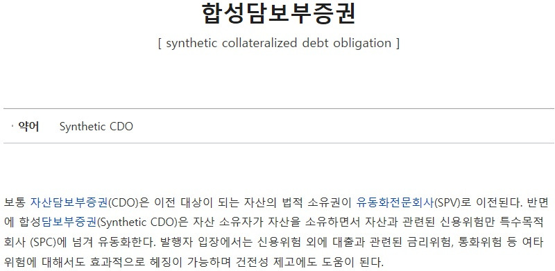 쉽게 설명하려 했는데 불가능해졌다. 영화의 주인공들이 모두 투자의 귀재들인데도 대부분 이런 파생상품들에 대해 정확히 이해하지 못해 누군가의 설명으로 실체를 깨닫고는 소스라치게 놀라는 장면들이 반복된다. 일반인인 여러분이 이 글을 통해 내용을 이해하지 못하는 것은 당연한 일이니 부디 자괴감에 빠지지 않기 바란다.