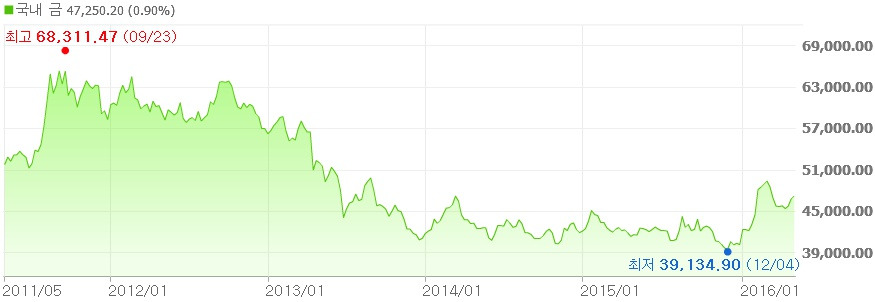 2011년 9월 68,311원 이었던 금값이 2015년 12월 39,134원까지 떨어졌다. 거의 반토막이다. 서브프라임 이후 대대적인 양적완화가 시행됐고 이로 인해 약 달러가 지속됐다. –'알기 쉬운 경제 이야기' 일독을 권함-
