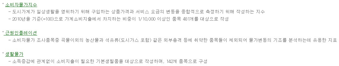 물가상승률에 대한 지표로 '소비자물가지수'를 사용한다.