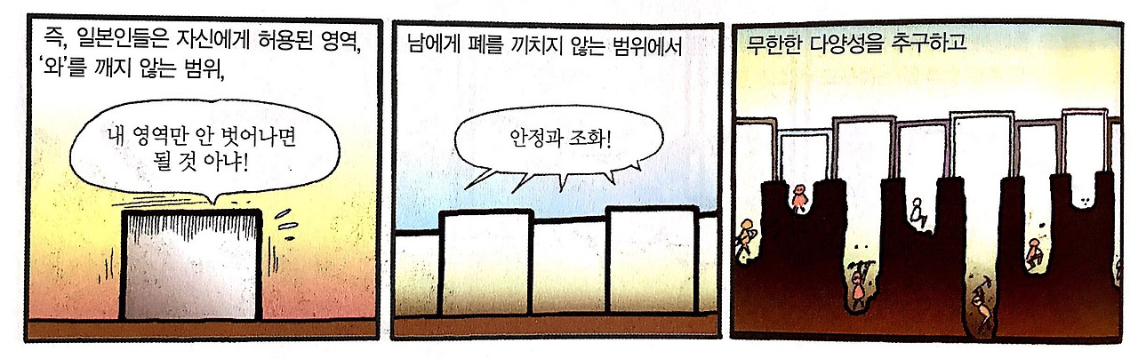 일본인들은 "わ 와 (和 우리나라 발음으로 화)"를 중시하다 보니 다른 사람과의 조화를 우선으로 생각하고, 그러다 보니 자기에게 주어진 맡은 일에 집중하며, 다른 이의 영역은 건드리지 않는다. 그들은 튀는 행동은 손해로 돌아오기에 겉으로는 사회와 조직이 요구하는 규정에 맞추려 한다는 것이다. 그러나 그들도 개성 있는 사람이기에 "허용된 범위"안에서 무한한 다양성을 추구하고 예컨대 좋아하는 일을 하고 그것에 깊게 깊게 파고든다. 이 책에서 설명하는 오타쿠의 기원이다. 아..... 이거 왠지 내 얘기 같은데... 나는 한순간 오타쿠와의 동질감을 느낀다. 그들은 "그들이 그렇다면 그런" 내가 추구하는 제멋대로 세계의 선구자들인 것이다.