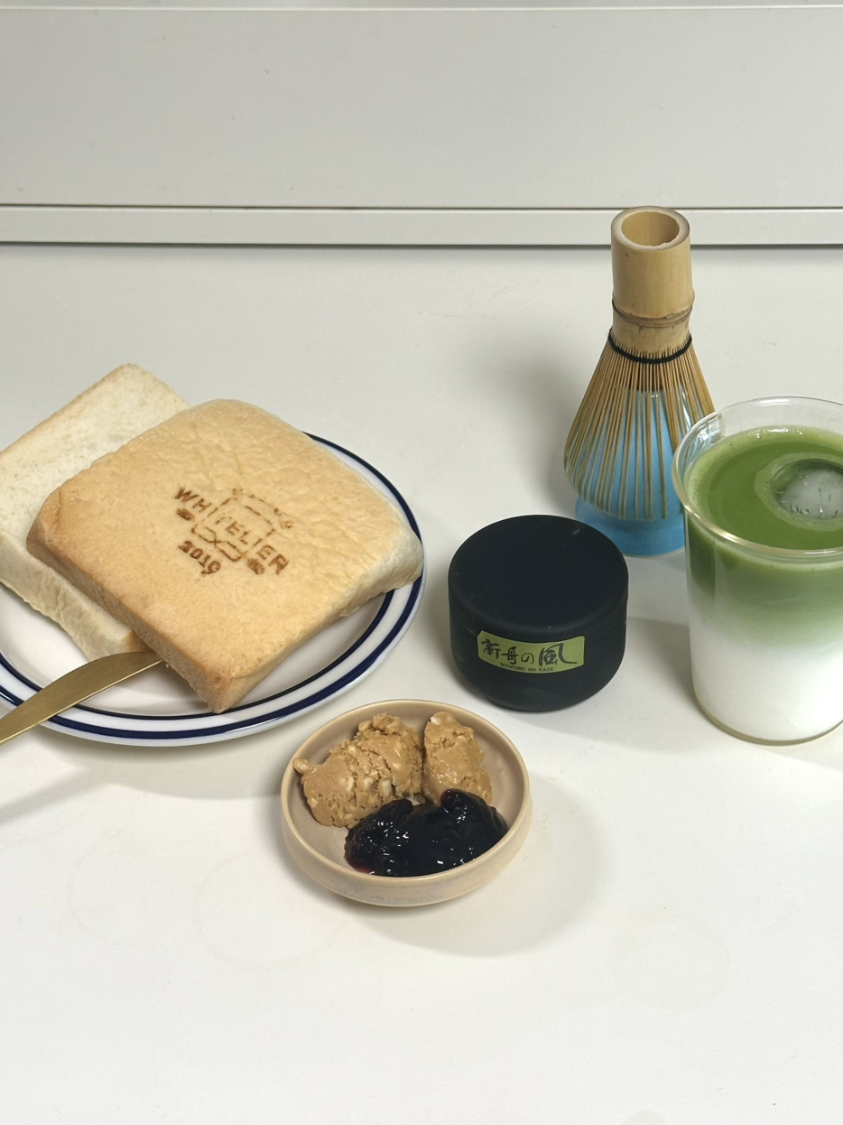 점심은 뜻밖에도 요즘 가장 화제를 모으고 있는 조합이다. 연일 품절 사태를 빚고 있는 화이트리에 우유식빵과 전 세계적으로 사랑받고 있는 말차 라떼 한 잔을 곁들였다.