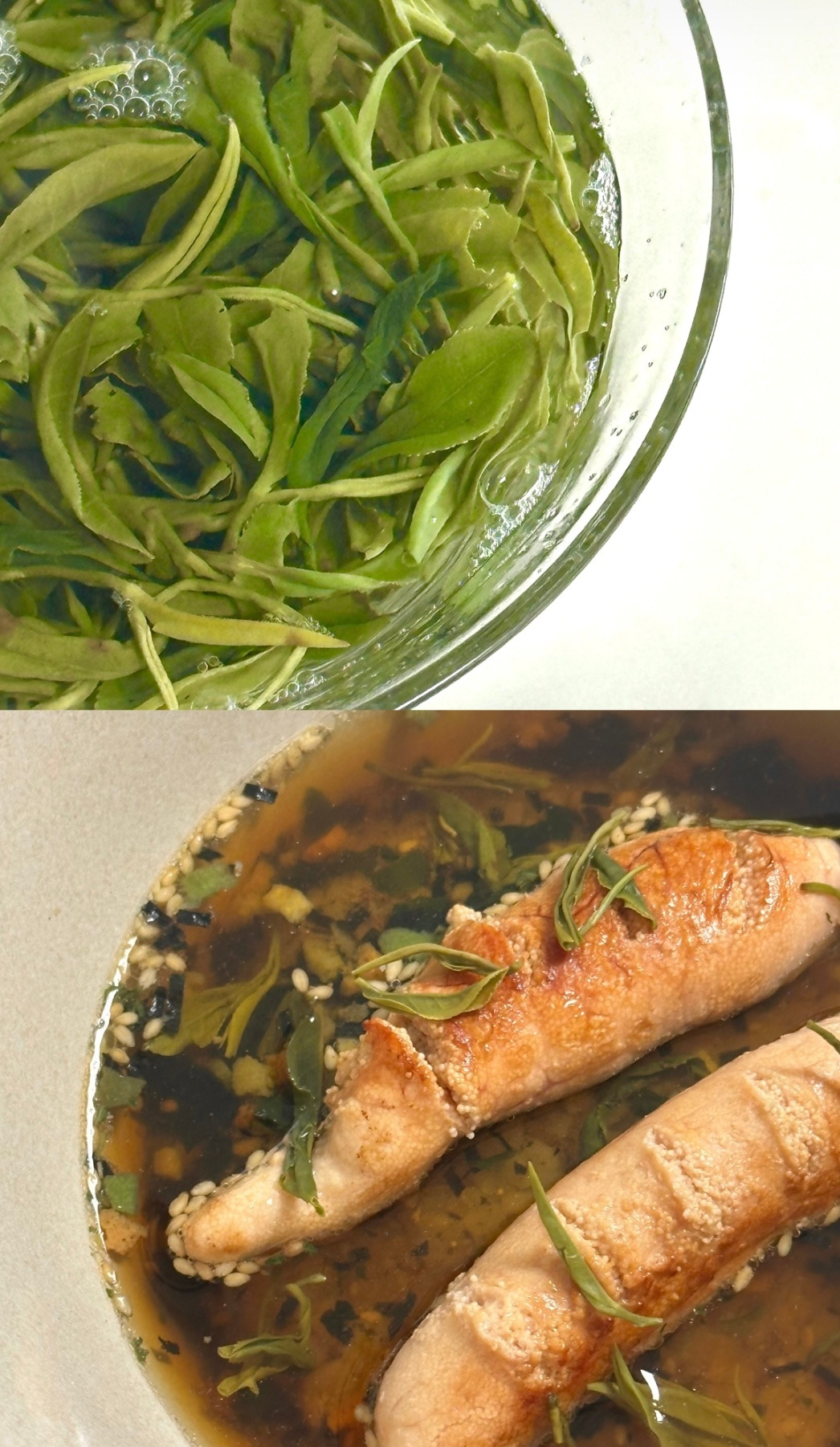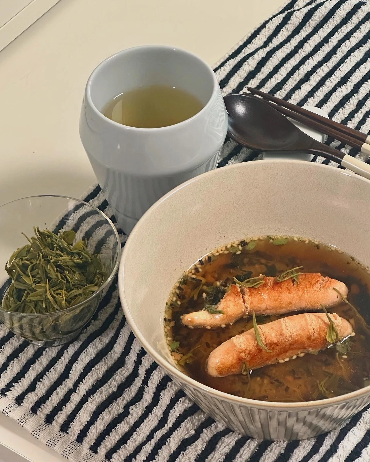 티백이 아닌 녹차잎을 사용했을 경우, 식후에 마실 차까지 우린 뒤에 남은 엽저를 밥 위에 숑숑 올려 세팅해 주면 육안으로 보기에도 좋지만 식감도 정말 훌륭하다.