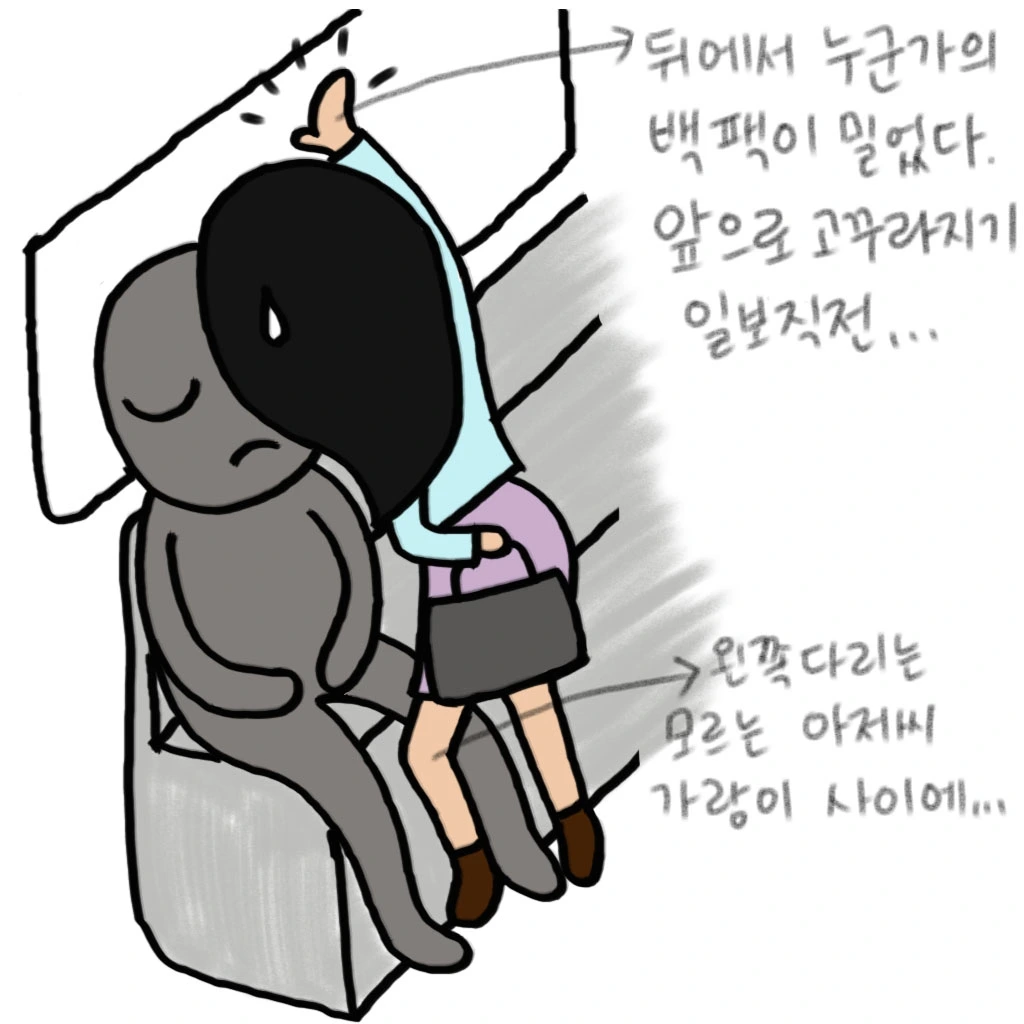 그리고 9호선에 서서 가는 것은 전혀, 전혀 전혀, 즈언혀 괜찮지 않았다. 그날 나는 피지컬이 후져서 몸싸움에서 밀리는 운동선수처럼 한없이 밀려났다. 다리에 딱 힘을 주고! 자세를 낮추고! 어떻게든 버텨보려 했지만, 역부족이었다. 끊임없이 밀려 들어오는 인파에 어버버.... 하며 비틀비틀 밀려나다가 정신을 차려보니, 내 왼쪽 무릎이 앉아있는 아저씨의 두 무릎 사이에 있었다. 민망하기 짝이 없었지만 앉아있던 나도 아저씨도 서로 모르는 척했다. 이제 더 이상 밀려날 곳이 없는데 뒤에서 누군가의 백팩이 내 등을 떠밀었다. 허리 근육마저 시원찮은 나의 상체는 앞으로 고꾸라졌고, 유리창을 손으로 짚어 더 민망한 상황은 간신히 면했다. (코어 근육이 이래서 중요하다) 상체를 일으키고 싶었지만 그럴 수 없었다. 뒤에서 누군가의 백팩이 나를 계속 밀고 있었기 때문에 버티는 것만 해도 버거웠다.