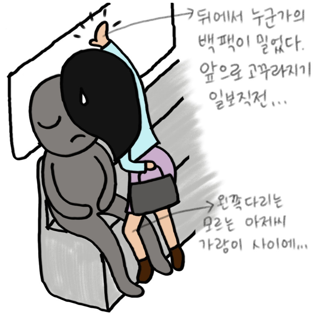 진짜 이 정도로 한 뼘 공간이 아쉽기 때문에, 매너가 있으신 분들은 엉덩이를 등받이에 딱 붙여 앉는다. 서서 힘들게 가는 사람들에게 조금이라도 공간을 더 주기 위해서이다.