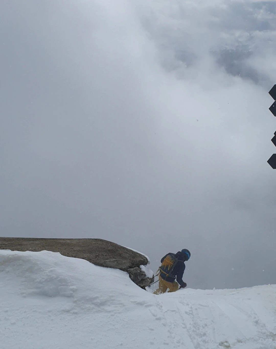 스키 장비를 든 사람들을 유심히 지켜보며 케이블카에서 내렸다. 정상은 4월이란 말이 무색하게 한겨울이었다. 우리가 운동화로 눈을 밟고 밖으로 나가는 동안 스키어들은 스키부츠로 어그적 거리며 앞으로 나아갔다. 어느 이정표 앞에서 한 남자가 멈췄다. 스키어 무리를 지켜보던 우리는 그가 왜 멈췄지라며 바라보았다. 순간 그는 스키 슬레이트를 어깨에서 내려 착착 끼우고는 입가에 미세한 미소를 머금었다. 짙은 색 고글 뒤로 우리를 보는지 알 수는 없었지만 마치 나 한번 볼래?라는 표정이었다. 순식간에 뒤를 돌아 가파른 절벽에 가까운 비탈길을 스키 에지로 내려가버렸다. 입이 떡 벌어졌다. 작은 팻말은 알고 보니 스키 코스를 가리키는 것이었다. 우리는 순간 모두 경악했다. " 스키날로 내려갔어!" 놀라서 다시 한번 경사를 내다봤다. 그는 이미 보이지 않았고 우리는 너무 놀라 서로 감탄사만 주고받았다.
