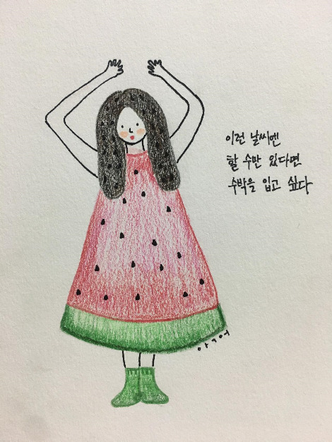집에 오는 길에 웬일이지 싶을 만큼 값이 싼 수박을 보고선 과일가게 앞에 섰다. 혼자 사는 우리 집에 저 수박 누가 다 먹나. 음식물 쓰레기만 나오겠지. 됐다 싶어 참외 4개를 골라 담는다. 애꿎은 수박을 힐끔거리며 생각한다. 이런 날씨엔 수박을 먹기보다 차라리 입을 수 있다면 좋겠다고. 나처럼 혼자 사는 사람도 수박 한 통 사가지고 와 반 통은 입으로 먹고 반 통은 옷으로 해 입을 수 있다면 얼마나 좋을까. 몸이 안팎으로 수박수박 청량해지는 상상을 하며 집으로 온다.