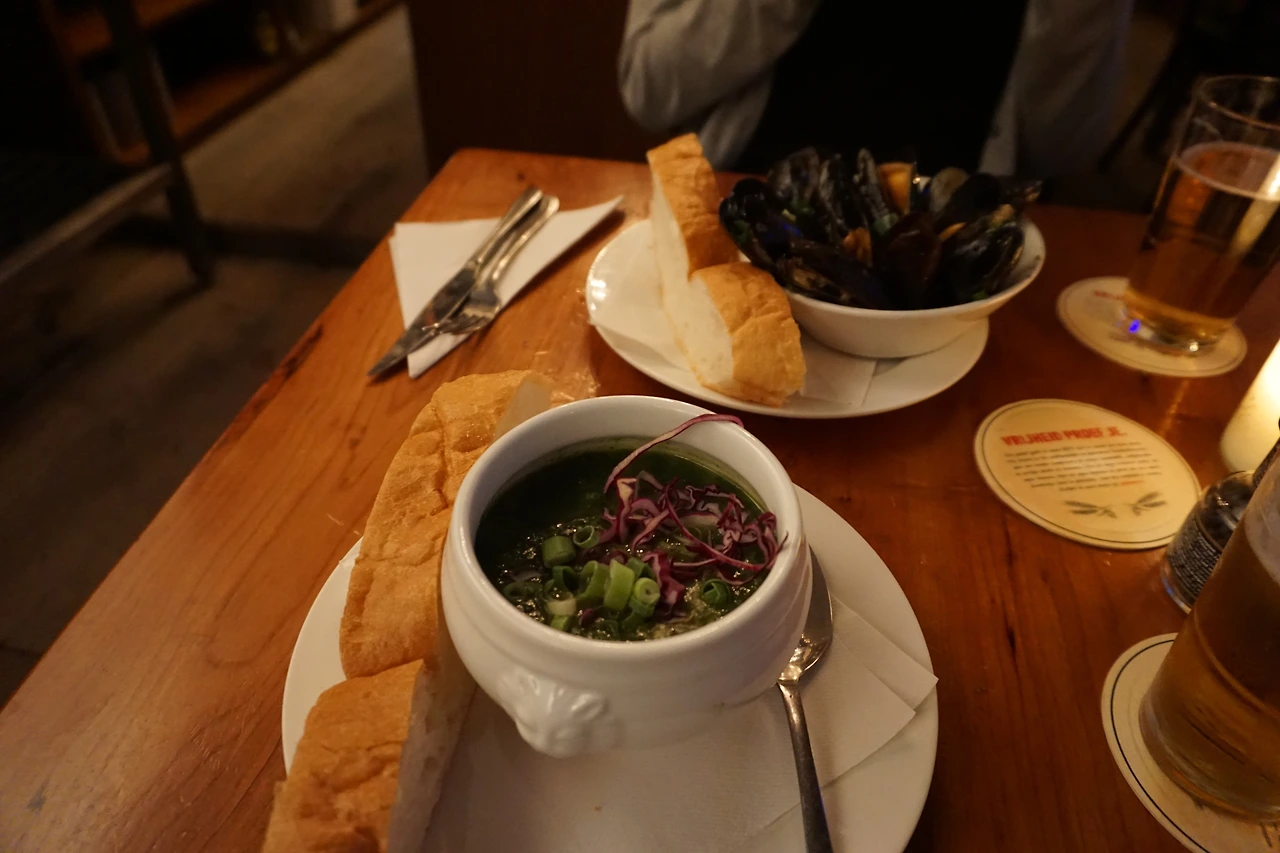 우리는 애피타이저로 가장 많이 먹는 시금치 수프와 우리가 따로 먹고 싶었던 홍합요리를 시켰다.