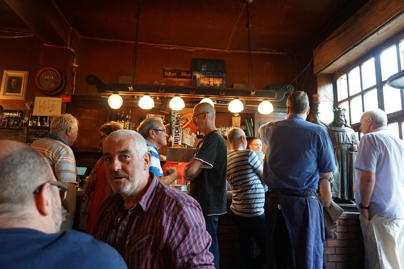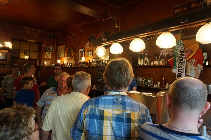 그리고 바에서는 사람들이 쾰시를 한잔씩 하기 위해 줄을 서있었다.