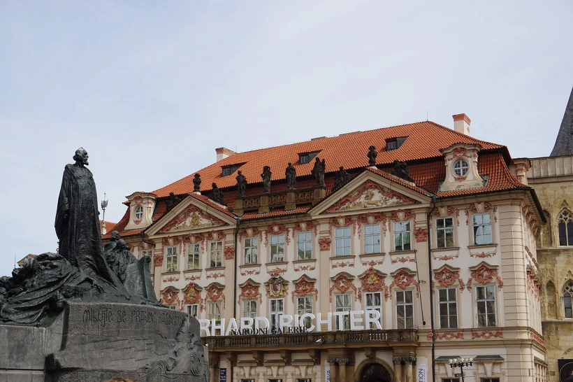 얀 후스 동상 뒤로 보이는 체스카 나르더니 갤러리 (국립 미술관) - 로코코 양식으로 바로크 양식보다 훨씬 화려하게 만들어졌다고 한다.