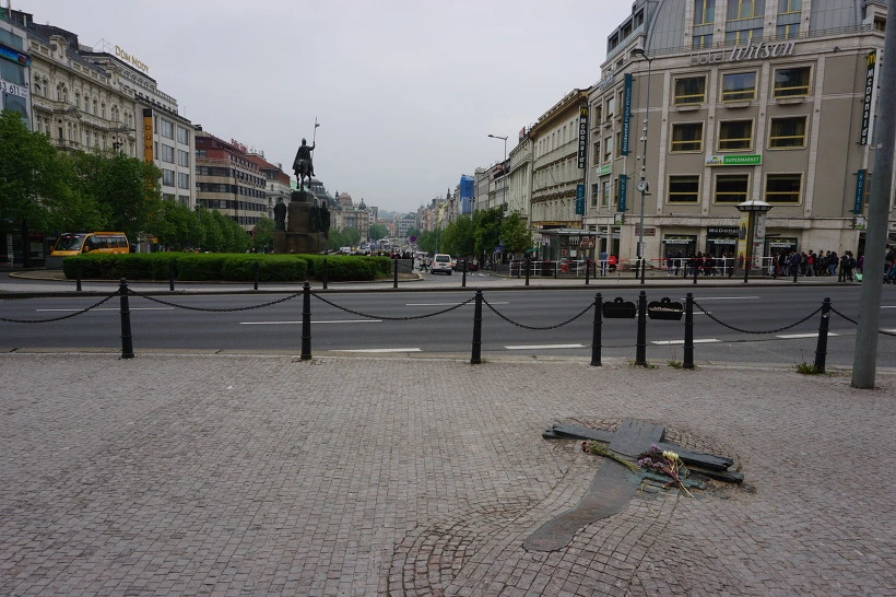 이후 압박이 더 심해지고 체코 사람들은 민주화를 거의 반포기하고 살수 밖에 없는 상황이 된다. 카를대 철학과 학생들이 다시 집결해서 한 달에 한 번씩 분신자살을 하기로 기획하고 팔라흐, 자이츠, 이브 쉔 학생 순으로 3개월간 투신자살을 한다. 위의 십자가는 팔라흐가 투신을 한 장소를 기리기 위해서 만들었다고 한다. 국립중앙박물관 바로 앞 바츨라프 광장이 시작되는 곳에 위치하고 있다.