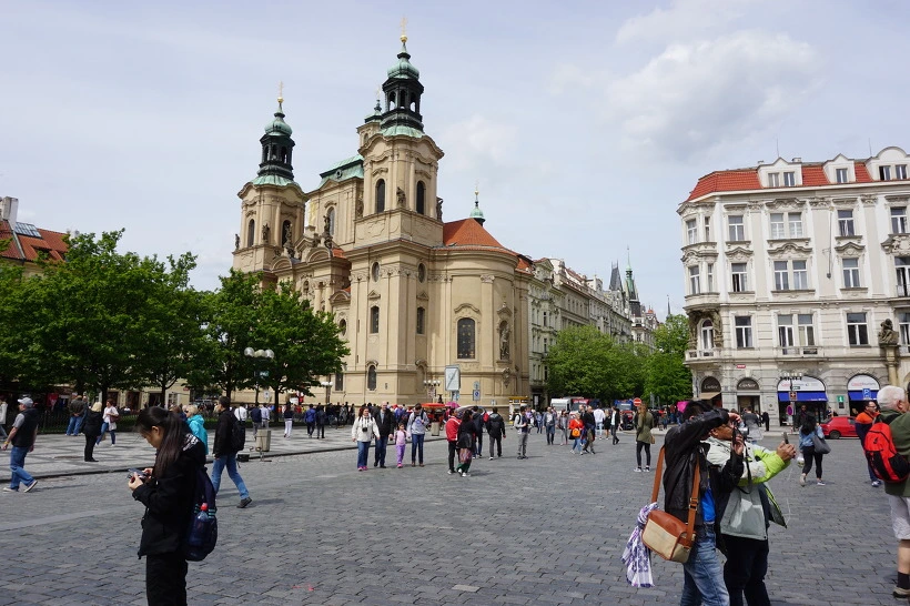 세인트 니콜라스 성당 - 맞은편 노란 건물도 성당 틴 성당과 400년 차이가 난다. 1700년대 바로크 양식으로 곡선, 화려함의 특징이 있다.