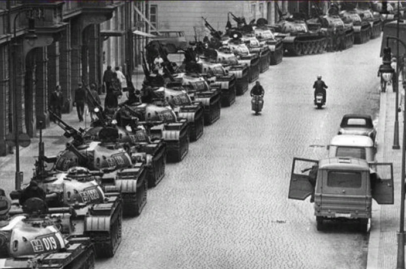 다른 동유럽 국가에 없던 이 변화가 탐탁지 않았던 소련은 둡첵을 저지하려 했지만 실패하자 선전포고를 하고 1968년 8월 20일 수많은 탱크를 앞세워 프라하로 진격을 한다. 이때 체코 외곽의 사람들은 표지판도 바꾸고 진격을 막기 위한 노력을 하지만 결국 이 바츨라프 광장에 탱크부대가 들어오게 된다.